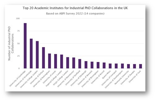 Figure 3. Top 20 academic institutions for supporting PhD studentships with pharmaceutical industry. 2022 data are compiled from 14 survey respondents including nil returns. Refer to previous iterations for more information on previous years.