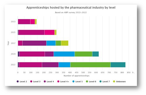 • The number of apprentices being trained by pharmaceutical companies captured, is at its highest ever, up by around a third since 2019 at 825. This is an almost 3-fold increase since 2015.